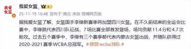 众所周知,我爱女篮的消息相对还是很靠谱的,因此,李缘加盟四川女篮的消息,大概率会是真的。