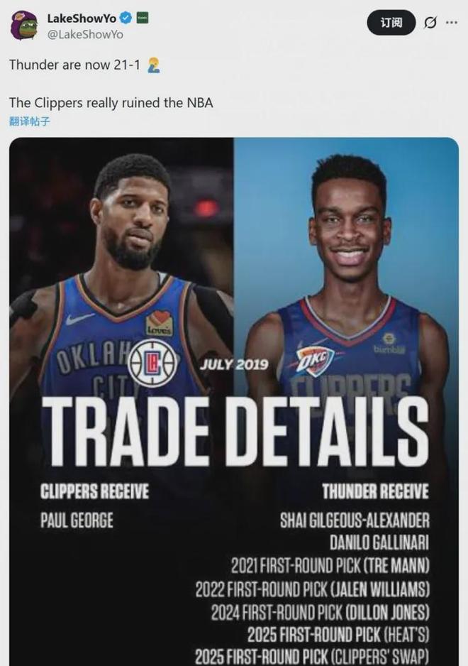 湖人自媒体LakeShowYo对此写道:“雷霆现在21胜1负,快船毁了联盟。”